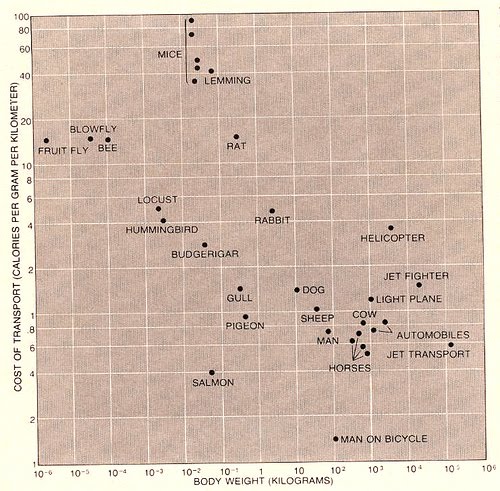 Coste del transporte (Calorías * gramos * kilómetros) vs peso corporal (kilogramos). El Gráfico sobre la Eficiencia de Iain Boal.